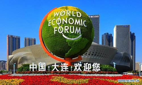 Photo taken on June 24, 2019 shows the welcome sign outside the Dalian International Conference Center in Dalian, northeast China's Liaoning Province. The 2019 Summer Davos meeting will be held from July 1-3 in northeast China's coastal city of Dalian, with globalization in the spotlight. Also known as the 13th Annual Meeting of the New Champions, this year's forum will feature the theme "Leadership 4.0: Succeeding in a New Era of Globalization." (Photo: Xinhua)