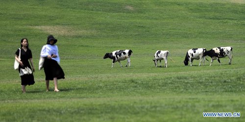 Tourists visit the Sanhuan pastureland in Dalian, northeast China's Liaoning Province, June 26, 2019. The 2019 Summer Davos meeting will be held from July 1-3 in northeast China's coastal city of Dalian, with globalization in the spotlight. Also known as the 13th Annual Meeting of the New Champions, this year's forum will feature the theme "Leadership 4.0: Succeeding in a New Era of Globalization." (Photo: Xinhua)