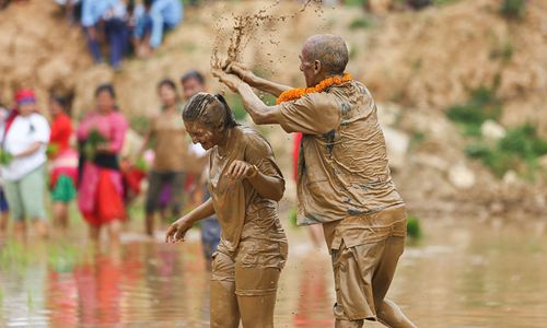 A man splashes muddy water onto a lady during the celebration of the National Paddy Day at the Dhunibesi Muncipality, in Dhading, Nepal on June 30, 2019. Photo: Sunil Pradhan/SOPA Images/LightRocket via Getty Images/VCG