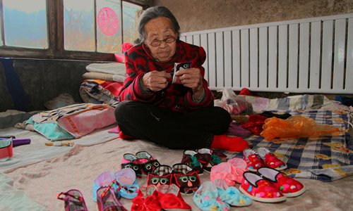 A grandmother sews cloth shoes for children at home. Photo: VCG