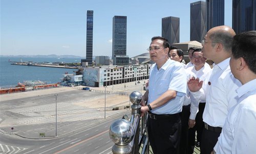 Chinese Premier Li Keqiang, also a member of the Standing Committee of the Political Bureau of the Communist Party of China Central Committee, hears a briefing on development driven by the opening-up of Liaoning's coastal areas while inspecting the Liaoning Port Group in Dalian, northeast China's Liaoning Province, July 1, 2019. Li on Monday went on an inspection tour to Dalian. (Photo: Xinhua)
