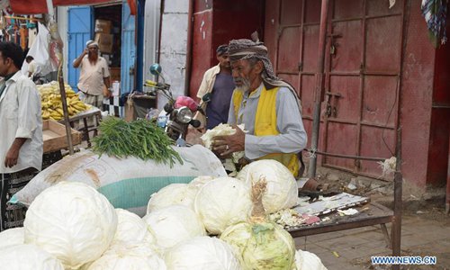 An old man sells vegetables at a public market in the government-controlled southern city of Dhalea, Yemen, July 1, 2019. For over five years, Yemen experienced a prolonged conflict pitting the country's government forces backed by a Saudi-led coalition against the Houthi rebels allied with Iran. The armed confrontations are still ongoing and expanding further to new areas, forcing thousands of helpless Yemeni people to cope with most difficult living conditions caused by the deadly years-long conflict. (Photo: Xinhua)