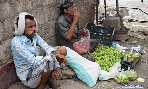 Vendors are seen at a public market in the government-controlled city of Dhalea, Yemen, July 1, 2019. For over five years, Yemen experienced a prolonged conflict pitting the country's government forces backed by a Saudi-led coalition against the Houthi rebels allied with Iran. The armed confrontations are still ongoing and expanding further to new areas, forcing thousands of helpless Yemeni people to cope with most difficult living conditions caused by the deadly years-long conflict. (Photo: Xinhua)