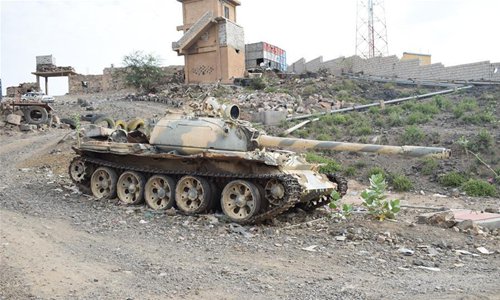 A partially destroyed tank is seen at a pro-government military position in the city of Dhalea, Yemen, July 1, 2019. For over five years, Yemen experienced a prolonged conflict pitting the country's government forces backed by a Saudi-led coalition against the Houthi rebels allied with Iran. The armed confrontations are still ongoing and expanding further to new areas, forcing thousands of helpless Yemeni people to cope with most difficult living conditions caused by the deadly years-long conflict. (Photo: Xinhua)