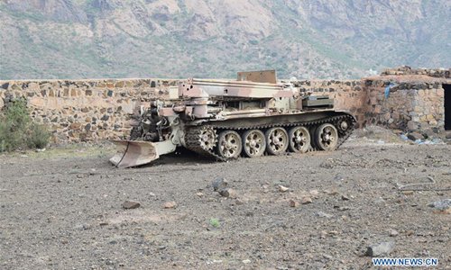 A government forces tank is seen at a military position in the city of Dhalea, Yemen, July 1, 2019. For over five years, Yemen experienced a prolonged conflict pitting the country's government forces backed by a Saudi-led coalition against the Houthi rebels allied with Iran. The armed confrontations are still ongoing and expanding further to new areas, forcing thousands of helpless Yemeni people to cope with most difficult living conditions caused by the deadly years-long conflict. (Photo: Xinhua)
