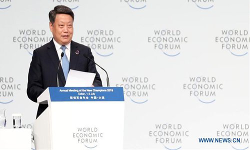 Tang Yijun, the Liaoning governor, speaks at the opening plenary of the Annual Meeting of the New Champions 2019, also known as Summer Davos, in Dalian, northeast China's Liaoning Province, July 2, 2019.(Photo: Xinhua)