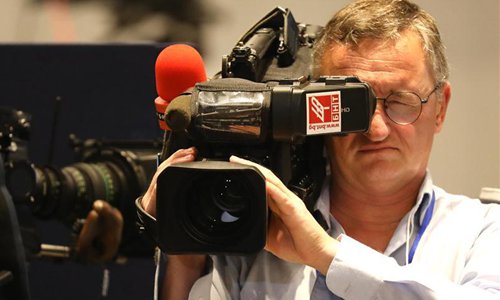 A cameraman works at the opening plenary of the Annual Meeting of the New Champions 2019, also known as Summer Davos, in Dalian, northeast China's Liaoning Province, July 2, 2019.(Photo: Xinhua)