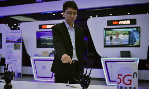 A visitor interacts with a robot during a technology fair in the Xiongan New Area, North China's Hebei Province on Tuesday. Xiongan has been taking the lead in the deployment of the ultra-fast 5G network, as part of its innovative development plan. The special economic zone has been a testing ground for 5G applications in real-world scenarios from city management to autonomous cars. Photo: IC