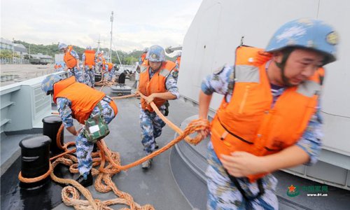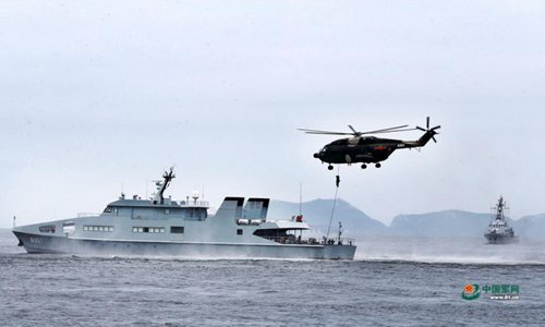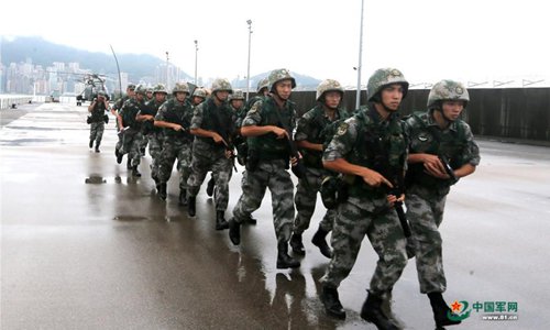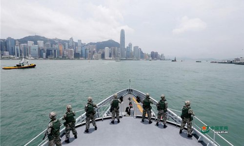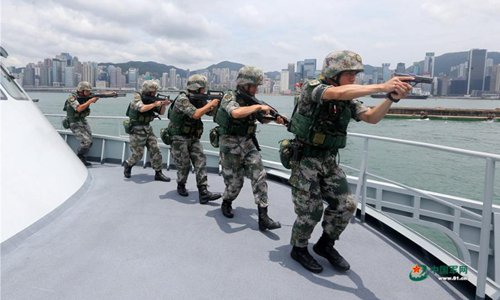 The Hong Kong Garrison of the Chinese People's Liberation Army (PLA) holds a drill in waters near Hong Kong, June 26, 2019. Members of the army, navy and air force of the PLA garrison in Hong Kong took part in the joint naval and air patrol exercise that aimed to review and raise the units' combat abilities in emergency dispatches, ad hoc deployment and joint operations. (Photo: 81.cn)