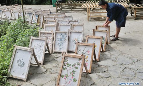 A woman from the Miao ethnic group dries paper made with traditional techniques in Shiqiao Village of Danzhai County, southwest China's Guizhou Province, July 1, 2019. Shiqiao Village is famous for the national intangible cultural heritage of traditional paper making. In recent years, local papermakers have combined traditional techniques with cultural innovation, making the ancient craft an eye-catcher in the tourism industry.(Photo: Xinhua)