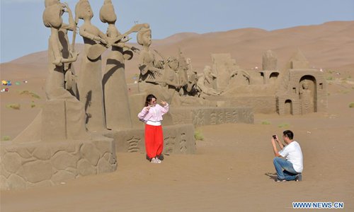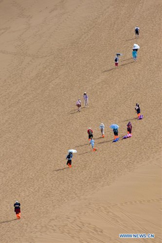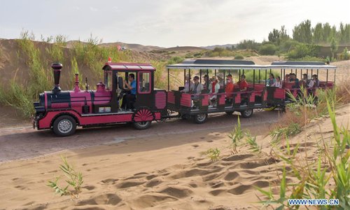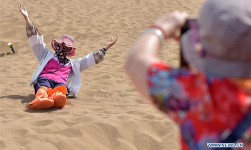 Tourists are seen at the Kum Tag Desert in Shanshan County, northwest China's Xinjiang Uygur Autonomous Region, July 2, 2019. The Kum Tag Desert has entered its golden season of tourism. (Photo: Xinhua)