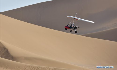 Tourists try a powered glider at the Kum Tag Desert in Shanshan County, northwest China's Xinjiang Uygur Autonomous Region, July 2, 2019. The Kum Tag Desert has entered its golden season of tourism. (Photo: Xinhua)
