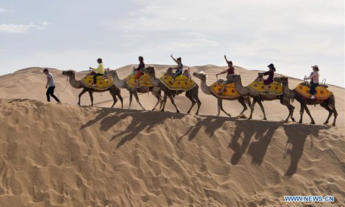 Tourists ride camels at the Kum Tag Desert in Shanshan County, northwest China's Xinjiang Uygur Autonomous Region, July 2, 2019. The Kum Tag Desert has entered its golden season of tourism.(Photo: Xinhua)