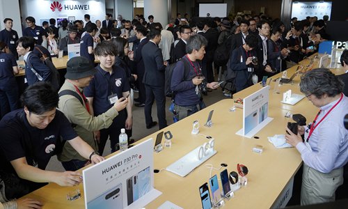Visitors try new Huawei P30 smartphones at a store in Tokyo on May 21. Photo: VCG