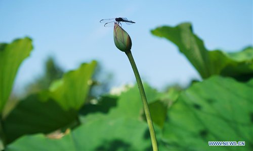 A dragonfly rests on a lotus seed pod at Kenilworth Park & Aquatic Gardens in Washington D.C., the United States, on July 3, 2019. (Photo: Xinhua)