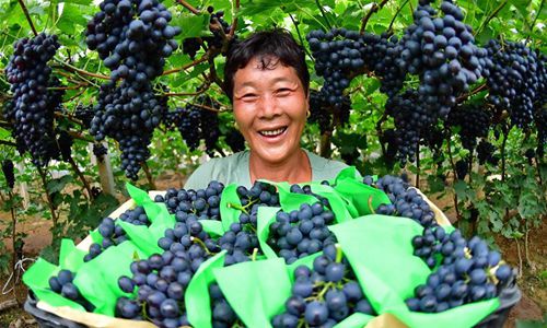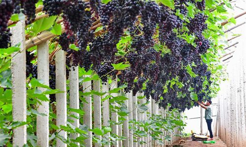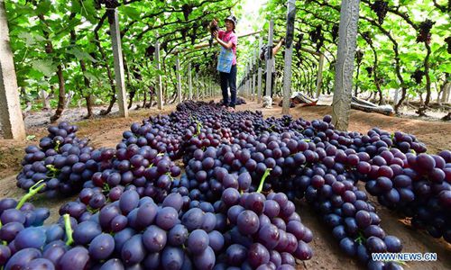 A farmer harvests ripe grapes in Zhaotan Village of Wangtan Township in Tangshan City, north China's Hebei Province, July 3, 2019. Local authorities encourage farmers to plant grapes to increase income. (Photo:Xinhua)