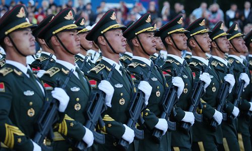Soldiers from the honor guard of the Chinese People's Liberation Army (PLA), march in unison during a military parade marking the Belarus Independence Day and the 75th anniversary of the Minsk liberation from Nazi invaders during the World War II. Photo: Natalia Fedosenko/TASS/VCG