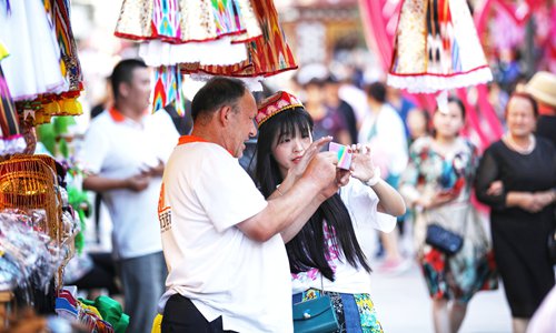 A tourist (right) talks with a vendor at a shopping area at the Grand Bazaar in Urumqi, capital of Northwest China’s Xinjiang Uyghur Autonomous Region on Friday. The Grand Bazaar is famous for specialties in Xinjiang, such as food and clothing of ethnic minority groups in the region. Photo: Cui Meng/GT
