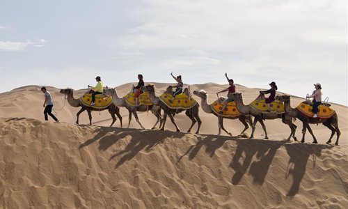Tourists ride camels at the Kum Tag Desert in Shanshan County, northwest China's Xinjiang Uygur Autonomous Region, July 2, 2019. The Kum Tag Desert has entered its golden season of tourism. (Xinhua/Ding Lei)