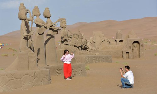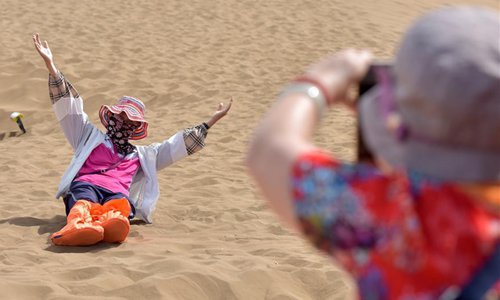 A tourist poses for photos at the Kum Tag Desert in Shanshan County, northwest China's Xinjiang Uygur Autonomous Region, July 2, 2019. The Kum Tag Desert has entered its golden season of tourism. (Xinhua/Ding Lei)