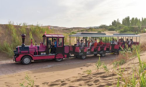 Tourists enter the Kum Tag Desert in Shanshan County, northwest China's Xinjiang Uygur Autonomous Region, July 2, 2019. The Kum Tag Desert has entered its golden season of tourism. (Xinhua/Ding Lei)