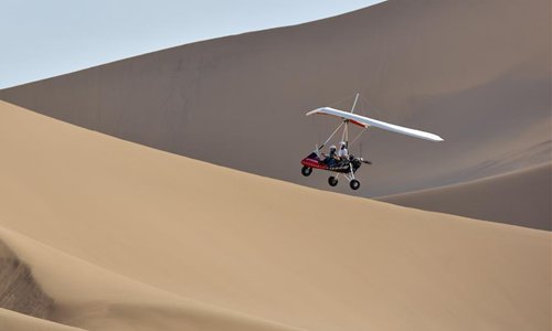 Tourists try a powered glider at the Kum Tag Desert in Shanshan County, northwest China's Xinjiang Uygur Autonomous Region, July 2, 2019. The Kum Tag Desert has entered its golden season of tourism. (Xinhua/Ding Lei)