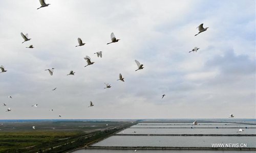 Cattle egrets fly over the Dafeng Milu National Nature Reserve in the city of Yancheng, east China's Jiangsu Province, June 27, 2019. China's Migratory Bird Sanctuaries along the coast of the Yellow Sea-Bohai Gulf (Phase I) were inscribed on the World Heritage List as a natural site on Friday at the ongoing 43rd session of the UNESCO World Heritage Committee in Azerbaijan's capital of Baku. Migratory Bird Sanctuaries along the coast of the Yellow Sea-Bohai Gulf of China are located in the Yellow Sea ecoregion, containing the world's largest continuous mudflat seashore. It is the central node of the East Asian-Australasian Flyway (EAAF), which is the most threatened migratory flyway worldwide and boasts the largest number of endangered and critically endangered species. The area has a high biodiversity, with about 280 species of fishes and more than 500 species of invertebrates, providing a variety of food resources for millions of migratory birds. (Xinhua/Li Xiang)