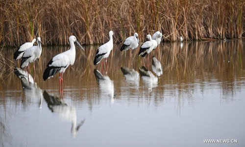 Wild birds are seen at the Yancheng Wetland and Rare Birds National Nature Reserve in east China's Jiangsu Province, Nov. 15, 2017. China's Migratory Bird Sanctuaries along the coast of the Yellow Sea-Bohai Gulf (Phase I) were inscribed on the World Heritage List as a natural site on Friday at the ongoing 43rd session of the UNESCO World Heritage Committee in Azerbaijan's capital of Baku. Migratory Bird Sanctuaries along the coast of the Yellow Sea-Bohai Gulf of China are located in the Yellow Sea ecoregion, containing the world's largest continuous mudflat seashore. It is the central node of the East Asian-Australasian Flyway (EAAF), which is the most threatened migratory flyway worldwide and boasts the largest number of endangered and critically endangered species. The area has a high biodiversity, with about 280 species of fishes and more than 500 species of invertebrates, providing a variety of food resources for millions of migratory birds. (Xinhua/Ji Chunpeng)