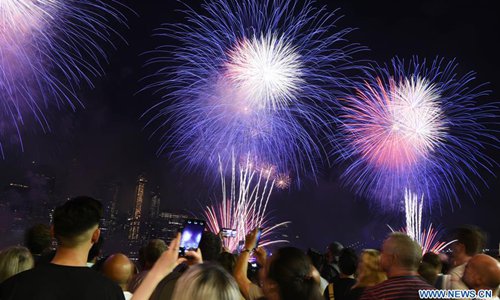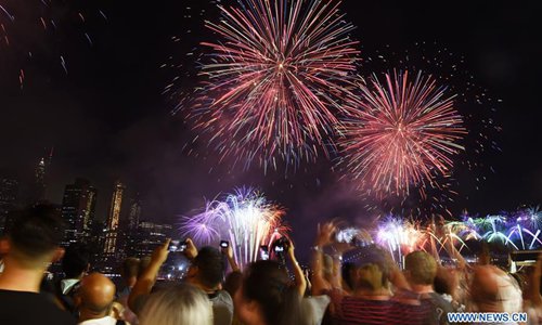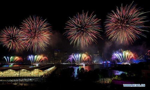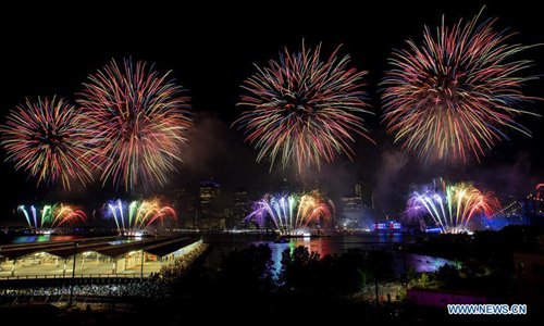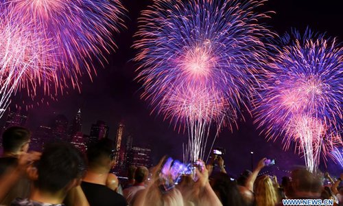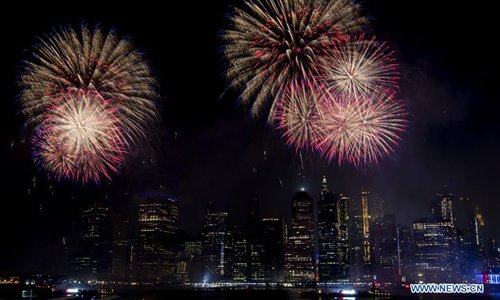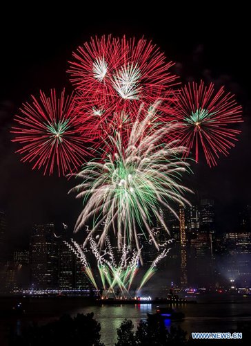 People watch fireworks exploding over the East River during U.S. Independence Day celebration in New York, the United States, July 4, 2019. Photo:Xinhua