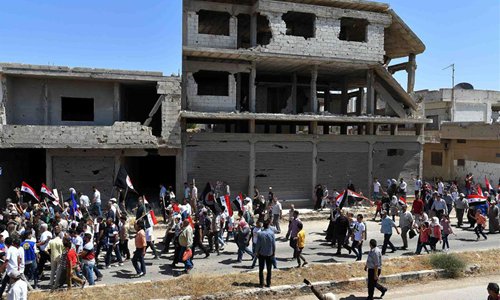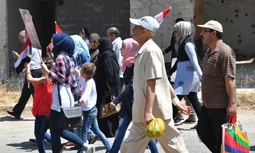 Syrian civilians enter the town of Al Qusayr in the countryside of Homs province, Syria, on July 7, 2019. Tens of families returned to check their homes in the town of Al Qusayr in central Syria on Sunday. (Xinhua/Ammar Safarjalani)