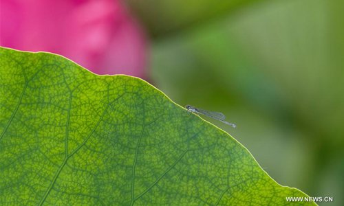 A dragonfly lands on a lotus leaf at a park in Wuhu, east China's Anhui Province, July 7, 2019. (Photo by Shui Congze/Xinhua)