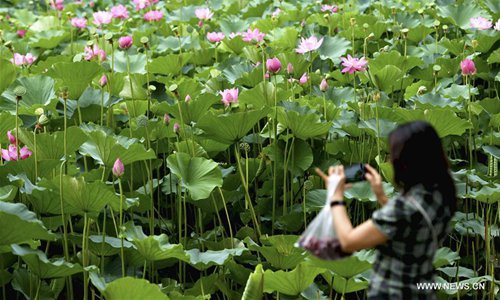 A woman takes photos of lotus flowers at a park in Qiaoxi District in Shijiazhuang, capital of north China's Hebei Province, July 7, 2019. (Photo by Chen Qibao/Xinhua)