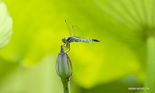 A dragonfly is perched on a lotus bud at a park in Wuhu, east China's Anhui Province, July 7, 2019. (Photo by Shui Congze/Xinhua)