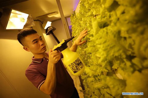 A crew member waters vegetables growing soil-free on the China's spacecraft tracking ship Yuanwang-3, on June 28, 2019. (Xinhua/Li Yuze)