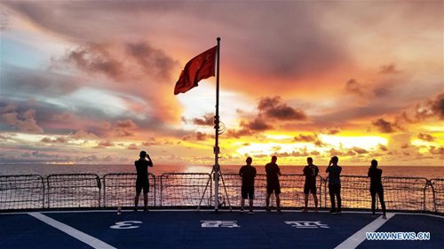 Crew members of China's spacecraft tracking ship Yuanwang-3 are seen on the deck, on June 18, 2019. (Xinhua/Li Yuze)