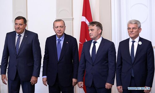 Chairman of Bosnia and Herzegovina's (BiH's) Presidency Milorad Dodik, Turkish President Recep Tayyip Erdogan, members of BiH's Presidency Zeljko Komsic and Sefik Dzaferovic (L to R) pose for photos in Sarajevo, Bosnia and Herzegovina, on July 8, 2019. Recep Tayyip Erdogan stressed here on Monday that his country will continue to provide support to preserve the stability, peace and prosperity of Bosnia and Herzegovina. (Photo: Xinhua)