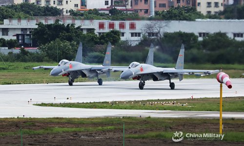 Two fighter jets attached to an aviation brigade of the air force under the PLA Southern Theater Command taxi on the runway before takeoff for a round-the-clock flight training exercise on July 4, 2019. (Photo: eng.chinamil.com.cn)