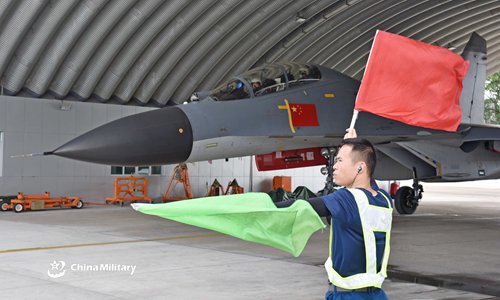 A ground crew signals a fighter jet to taxi out of the aircraft hanger for a round-the-clock flight training exercise conducted by an aviation brigade of the air force under the PLA Southern Theater Command on July 4, 2019. (Photo: eng.chinamil.com.cn)