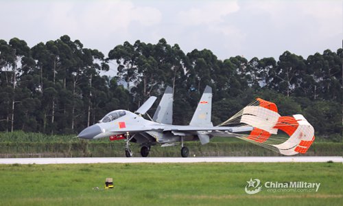 A fighter jet attached to an aviation brigade of the air force under the PLA Southern Theater Command deploys its drogue parachute to slow itself after landing during a round-the-clock flight training exercise on July 4, 2019. (Photo: eng.chinamil.com.cn)