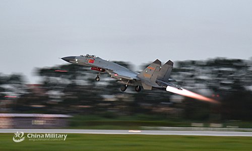 A fighter jet attached to an aviation brigade of the air force under the PLA Southern Theater Command takes off for a sortie during a round-the-clock flight training exercise on July 4, 2019. (Photo: eng.chinamil.com.cn)