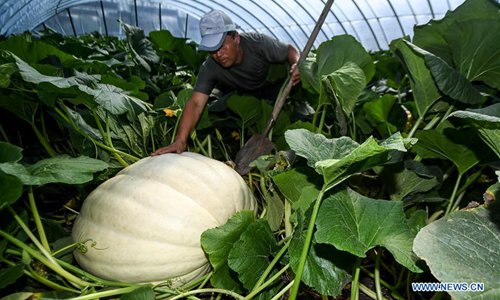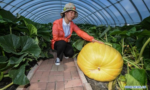 A staff worker takes care of giant pumpkins at a greenhouse in Changchun, capital of northeast China's Jilin Province, July 9, 2019. The 18th Changchun Agriculture and Food Expo will kick off here on Aug. 16. The giant pumpkins at the Changchun Agri-Expo Garden, which are expected to grow up to 500 kilograms by the opening of the expo, will be exhibited during the expo. (Photo: Xinhua)