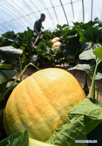 A staff worker takes care of giant pumpkins at a greenhouse in Changchun, capital of northeast China's Jilin Province, July 9, 2019. The 18th Changchun Agriculture and Food Expo will kick off here on Aug. 16. The giant pumpkins at the Changchun Agri-Expo Garden, which are expected to grow up to 500 kilograms by the opening of the expo, will be exhibited during the expo.(Photo: Xinhua)