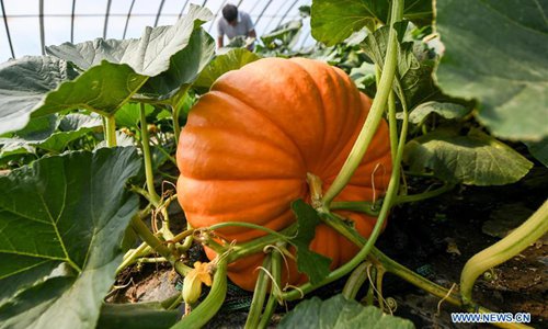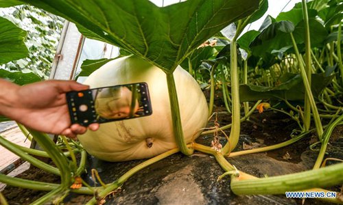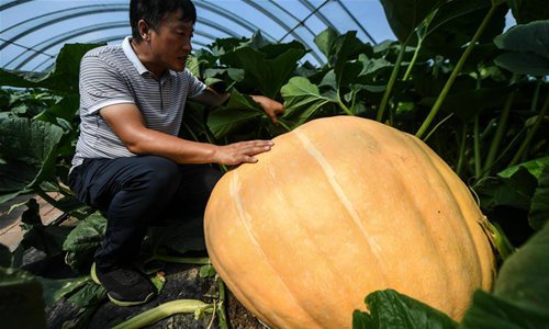 A staff worker checks the condition of a giant pumpkin at a greenhouse in Changchun, capital of northeast China's Jilin Province, July 9, 2019. The 18th Changchun Agriculture and Food Expo will kick off here on Aug. 16. The giant pumpkins at the Changchun Agri-Expo Garden, which are expected to grow up to 500 kilograms by the opening of the expo, will be exhibited during the expo. (Photo: Xinhua)