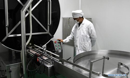 A staff member works at a dairy factory in Hongyuan County of Aba Tibetan and Qiang Autonomous Prefecture, southwest China's Sichuan Province, on July 8, 2019. Yak dairy has become herdsmen's important source of income as the local government helped organize a new cooperation model between the milk enterprises and herdsmen to upgrade the local yak milk production. Over 350 households have been lifted out of poverty and more than 500 local residents have found their job opportunities. (Photo: Xinhua)