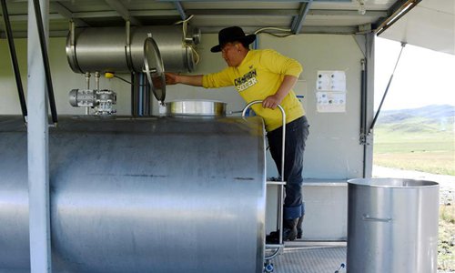 A staff member works at a milk collection station in Rekun Village, Hongyuan County of Aba Tibetan and Qiang Autonomous Prefecture, southwest China's Sichuan Province, on July 8, 2019. Yak dairy has become herdsmen's important source of income as the local government helped organize a new cooperation model between the milk enterprises and herdsmen to upgrade the local yak milk production. Over 350 households have been lifted out of poverty and more than 500 local residents have found their job opportunities. (Photo: Xinhua)