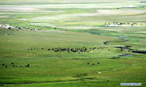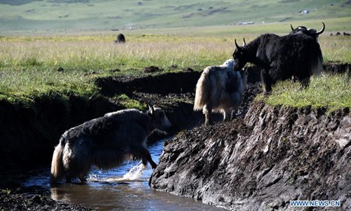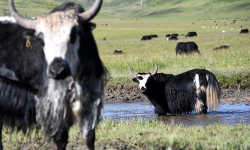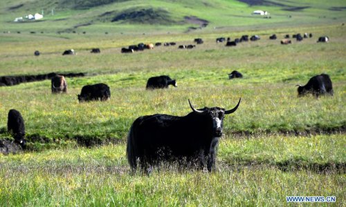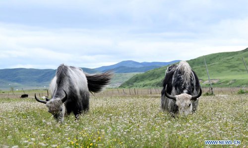 Yaks graze on the grassland in Rekun Village, Hongyuan County of Aba Tibetan and Qiang Autonomous Prefecture, southwest China's Sichuan Province, on July 8, 2019. Yak dairy has become herdsmen's important source of income as the local government helped organize a new cooperation model between the milk enterprises and herdsmen to upgrade the local yak milk production. Over 350 households have been lifted out of poverty and more than 500 local residents have found their job opportunities. (Photo: Xinhua)