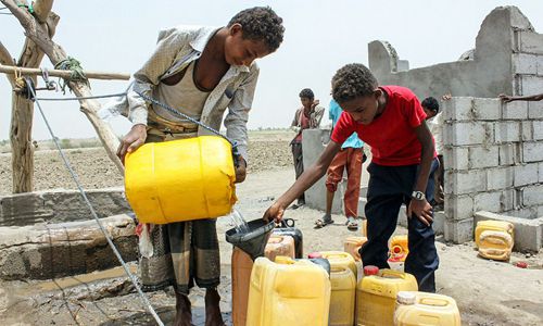 A child from the eastern Yemeni district of Durahemi pours water drawn from a well into jerry cans near the Red Sea port city of Hodeida on July 9, 2019. Photo: VCG