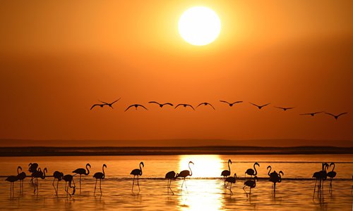 Flamingos are seen on Lake Tuz as the sun sets in the Konya province of Turkey on July 09, 2019. Lake Tuz is one of the most important areas where flamingos incubate in Turkey. Photo: VCG