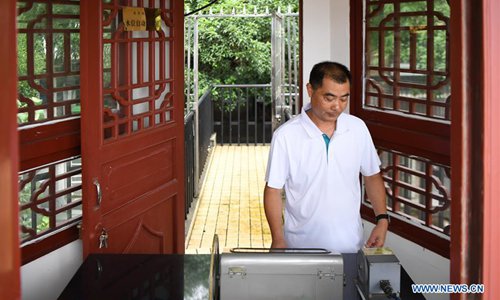 A staff member of Changsha's Hydrological Bureau monitors the water level of the Xiangjiang River in Changsha, central China's Hunan Province on July 9, 2019. Hunan hydrology and water resources investigation bureau issued a red alert for flood on Tuesday. As of 3 p.m. Tuesday, the water level of Xiangjiang River in Changsha has exceeded the alert level. The Juzizhou Islet scenic spot, located in Xiangjiang River, has closed for safety.(Photo: Xinhua)