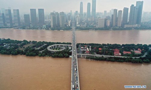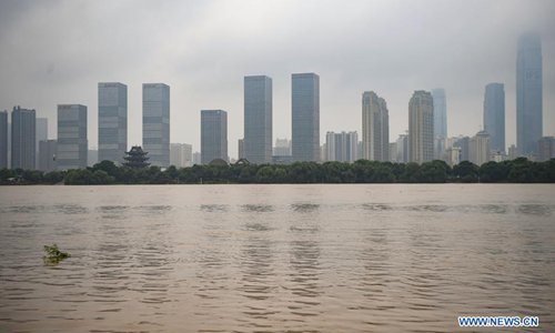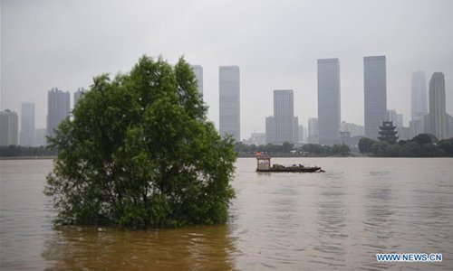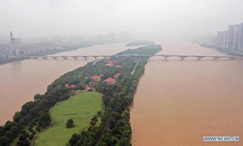 Photo taken on July 9, 2019 shows the flooded Xiangjiang River in Changsha, central China's Hunan Province. Hunan hydrology and water resources investigation bureau issued a red alert for flood on Tuesday. As of 3 p.m. Tuesday, the water level of Xiangjiang River in Changsha has exceeded the alert level. The Juzizhou Islet scenic spot, located in Xiangjiang River, has closed for safety.(Photo: Xinhua)
